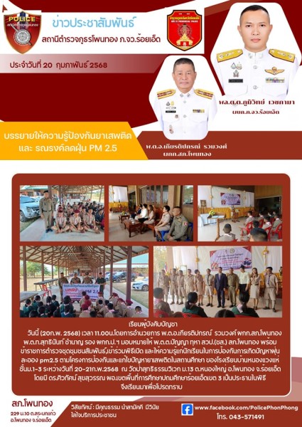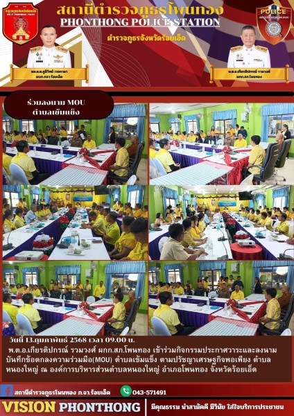 13 ก.พ. 68 เวลา 09.00 น. พ.ต.อ.เกียรติปกรณ์ รวมวงศ์ ผกก.สภ.โพนทอง ร่วมกิจกรรมประกาศวาระและลงนา...