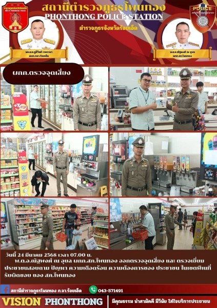 วันนี้ 24 มี.ค.68 เวลา 07.00 น. พ.ต.อ.ณัฐพงศ์ ณ อุบล ผกก.สภ.โพนทอง ออกตรวจจุดเสี่ยง ตรวจเยี่ยม...